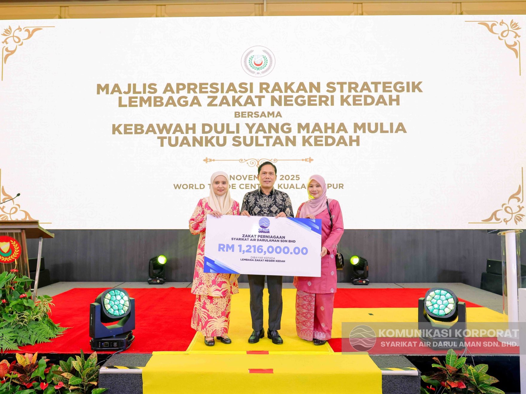KUALA LUMPUR, 25 November 2025 – Kebawah Duli Yang Maha Mulia Al Aminul Karim Sultan Sallehuddin Ibni Almarhum Sultan Badlishah, Sultan Kedah Darul Aman berkenan menerima replika cek bayaran Zakat Perniagaan Syarikat Air Darul Aman Sdn. Bhd. (SADA) bagi tahun 2024 berjumlah RM1,216,000.00.
