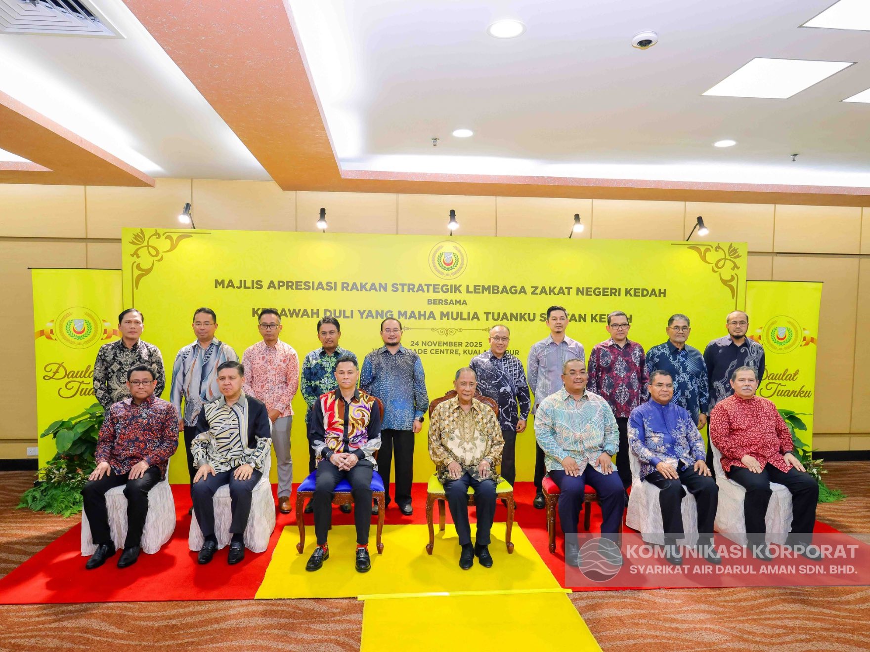 KUALA LUMPUR, 25 November 2025 – Kebawah Duli Yang Maha Mulia Al Aminul Karim Sultan Sallehuddin Ibni Almarhum Sultan Badlishah, Sultan Kedah Darul Aman berkenan menerima replika cek bayaran Zakat Perniagaan Syarikat Air Darul Aman Sdn. Bhd. (SADA) bagi tahun 2024 berjumlah RM1,216,000.00.